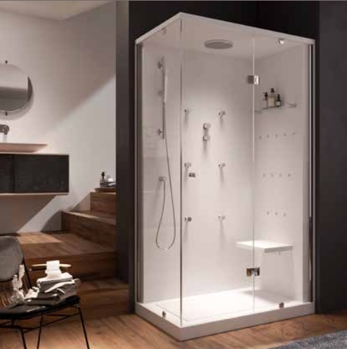 - Mando digital - Radio FM - Barra deslizante - Rociador techo - 12 jets impacto - Asiento - Grifería termostática - Desviador 5 vías - Control programación tiempo y temperatura vapor - Cromoterapia
