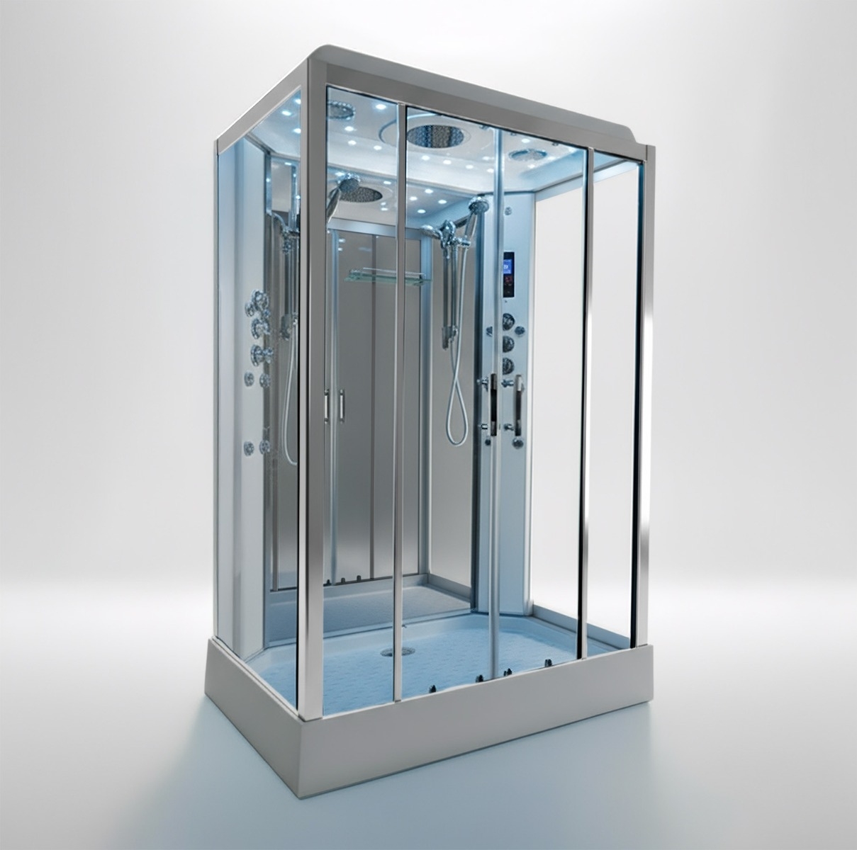 - Sistema de doble altavoz para una mayor experiencia multimedia - Cartucho termostático con elemento de cera Vernet - Teleducha de diseño de línea delgada - Estante de almacenamiento con riel cromado - Ducha de lluvia monzón de acero inoxidable - Iluminación interna Spectrum 7 colores - Sistema de ozono (03) - Ducha de lluvia monzónica integrada en la cubierta del techo - Tablero espejo - Iluminación de ambiente LED de bajo costo y larga duración - Iluminación interior - Puertas de fácil deslizamiento con cierre magnético - Cabezal de ducha fijo convenientemente posicionado - Radio FM incorporada - Compatibilidad Bluetooth incorporada en el panel de control - Base acrílica con marco de acero y pies ajustables - Cristal de vidrio templado tintado de 5mm - 12 jets hidromasaje omnidireccionales - Panel de control con pantalla táctil - Luz interna multicolor cambiante - Altura interior: 205 cm. - Conexiones de frío y calor - Se puede conectar a una caldera combinada - El suministro de agua a baja presión puede requerir una bomba. Presión recomendada de 2,5 Bar - Posición de automontaje - Aprobado por ISO9001 - Certificado CE